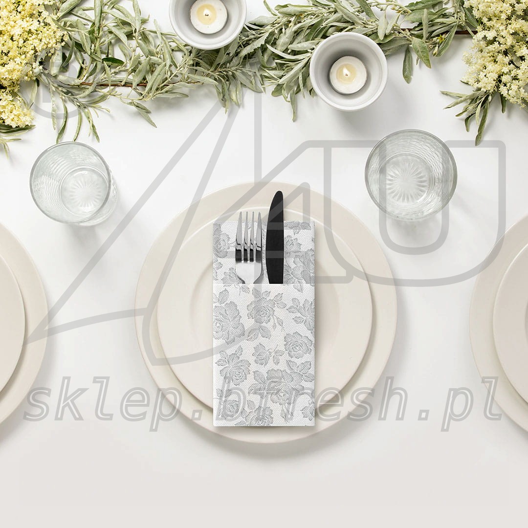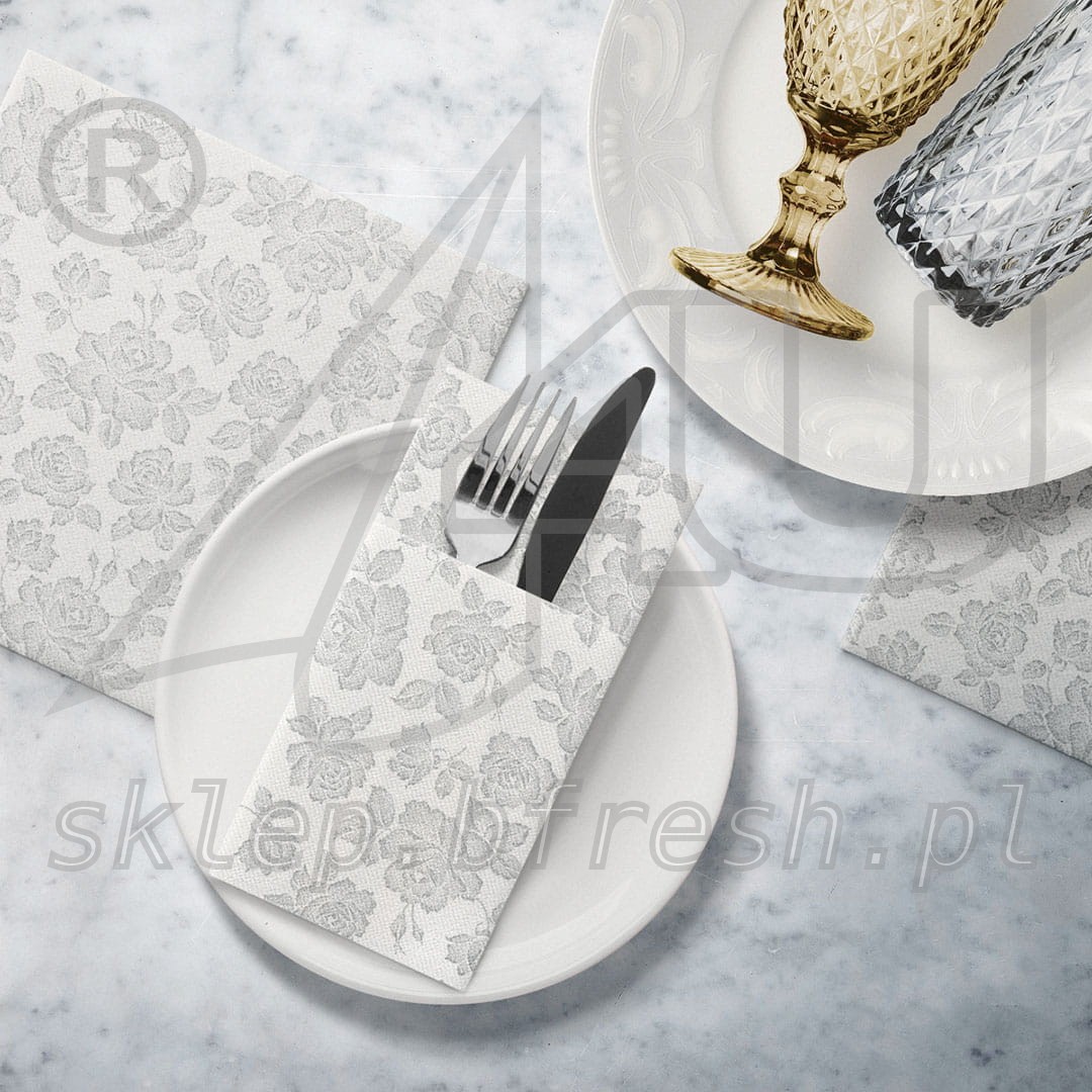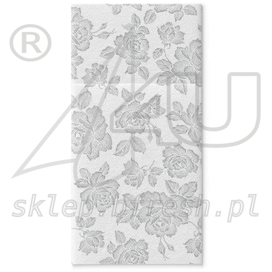Airlaid cutlery pockets 40 x 40 Subtle Roses Silver 1/8 folded 25 pcs